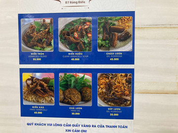 This place is usually the one recommended for eel, and also happened to be very close to our hotel, located at 87 Hang Dieu . We ordered 3 different eel preparations and liked them all. The difference is basically in broth vs rice porridge base. In the first photo, you can see mien nuoc in the top--fried eel and assorted veggies in broth. In the middle is the chao luon, eel in porridge. At the bottom is mien tron; all the greens and toppings you see here are the same as in the broth one at the top. The difference is with this one, the broth (which tasted then same to us) is on the side.