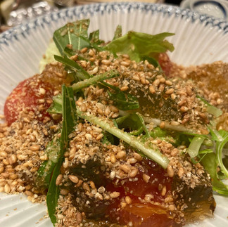Sardine lightly pickled (kyozushi) with tomatoes steamed greens and tofu dust 6/5