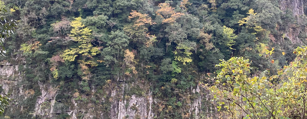 A third highlight of Takachiho is the Amanoiwato shrine and Amanoyasukawara (shrine inside a cave) adjacent to it. We parked at Amanoiwato. The complex is larger than we expected and has resident chickens and rabbits, and chicken-themed items to purchase at the temple store. At the end, there’s a parade of visitors down the street to the clearly marked entrance of the cave shrine. This was a spectacular walk along the river to a cave that is important in local lore. It’s a very easy walk— a total of 43 steps in all and those steps are small ( a few inches in height) and the whole way is paved. In November the fall colors were spectacular.